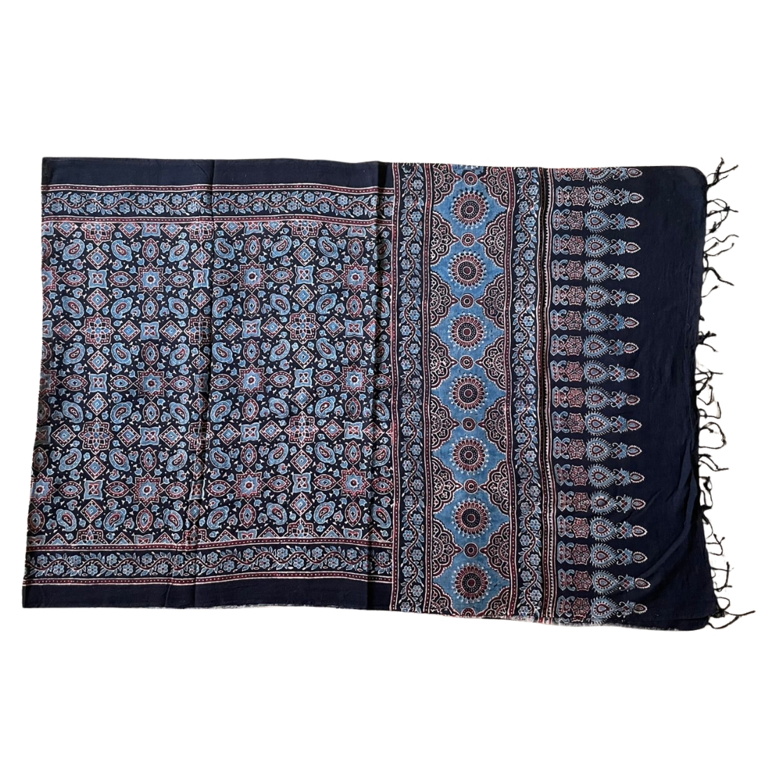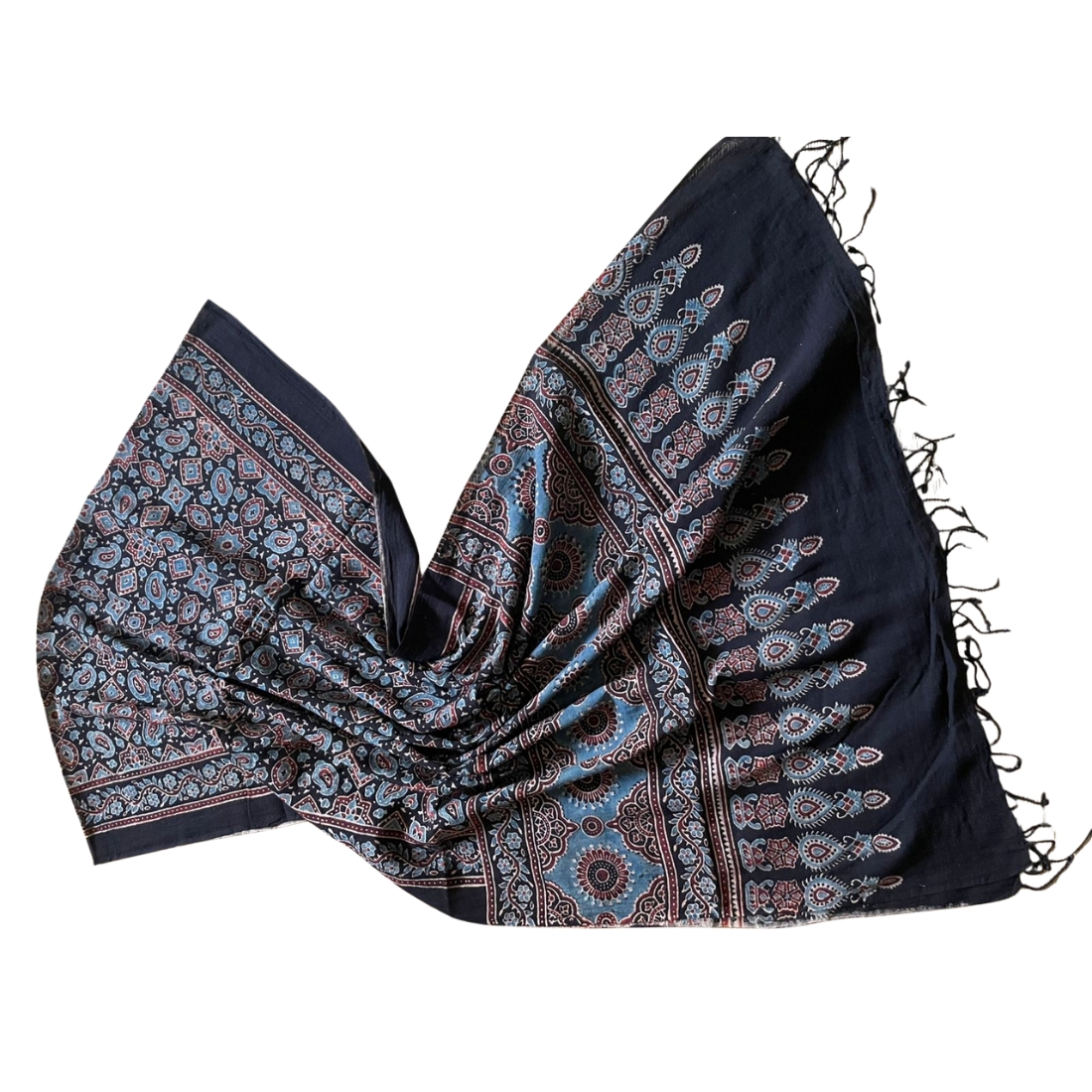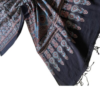 *** Note : This Ajrakh Cotton Stole is meticulously dyed by skilled artisans’ hands, imbuing it with the charm of authenticity. However, we’d like to gently remind you that the very essence of these creations lies in their individuality. You may find delightful variations, gentle unevenness, or enchanting patches in the dyeing process.