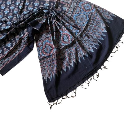 *** Note : This Ajrakh Print Stole is meticulously dyed by skilled artisans’ hands, imbuing it with the charm of authenticity. However, we’d like to gently remind you that the very essence of these creations lies in their individuality. You may find delightful variations, gentle unevenness, or enchanting patches in the dyeing process.