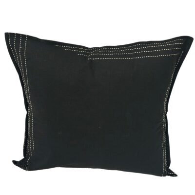 Handcrafted Black Cushion Cover. Crafted from natural dyed organic cotton fabric , this cushion cover features traditional Kantha embroidery in a captivating geometric pattern on the front, while the back remains elegantly plain. The base fabric in timeless black beautifully complements the intricate Kantha work done in a soothing natural sand color. Perfect for adding a touch of artisanal charm to your home decor, is a testament to craftsmanship and tradition.