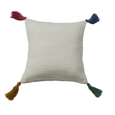 Simple & Adorable! This cushion cover with tassels is made of handspun and handwoven cotton fabric and beautiful multicolor tassels at all four corners. Tassels are made from post consumer recycled cotton.Every piece is hand cut and sewn. This cushion cover will surely add a charm to any home.