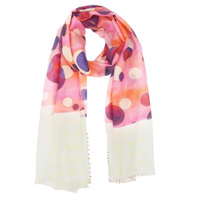 Digital Print Cotton Silk Scarf in bright Pink and brown combination. beautiful pebble design. There is attractive beads sewn at all the four corners of the scarves to give a perfect look.