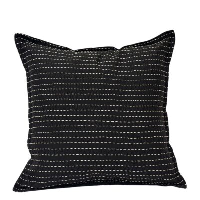 Handcrafted Kantha Embroidered Cushion Cover. Crafted from natural dyed organic cotton fabric , this cushion cover features traditional Kantha embroidery in a captivating geometric pattern on the front, while the back remains elegantly plain. The base fabric in timeless black beautifully complements the intricate Kantha work done in a soothing natural sand color. Perfect for adding a touch of artisanal charm to your home decor, is a testament to craftsmanship and tradition.