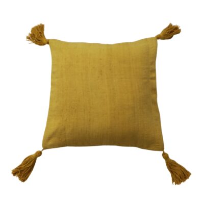Simple & Adorable! This yellow cushion cover is made of handspun and handwoven silk fabric which is natural dyed in yellow colour using marigold flowers. Beautiful matching tassels at all four corners. Tassels are made from post consumer recycled cotton.Every piece is hand cut and sewn. This cushion cover will surely add a charm to any home.
