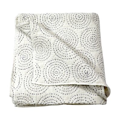 - Description: This Quilt for Queen Size and King size is made of two layers of organic cotton. Beautiful circle pattern of kantha stitches in blue colour is done by hand by Indian rural women which gives a lovely dimension to overall look to the bedding.