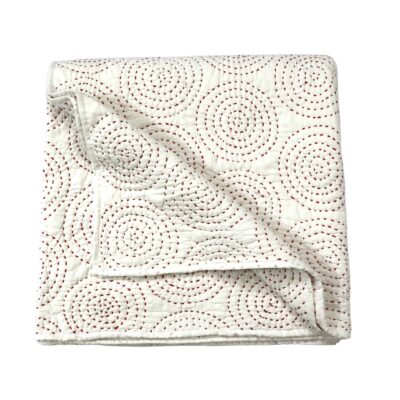 - Description: This Quilted Bedspread is made of two layers of organic cotton. Beautiful circle pattern of kantha stitches in tomato red colour is done by hand by Indian rural women which gives a lovely dimension to overall look to the bedding.