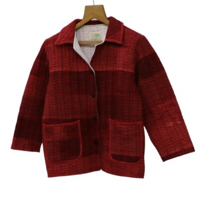 Description: This Quilted Jacket For Woman is made from luxurious handloom peace silk, dyed with the rich hues of natural madder. it features patchwork panels and hand Kantha quilting.