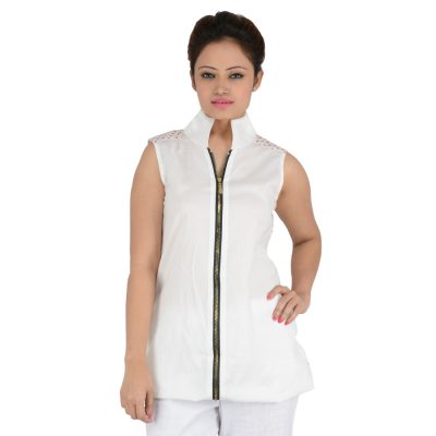 High Neck Organic Cotton herbal dyed long top with front opening & long metal zipper.Front is plain white and back side is polka dot to give a different look. Bottom edge of the top has elasitc to wear in different way like long or short as balloon shape as shown in the picture.